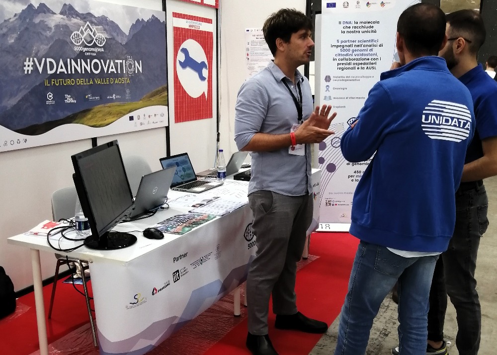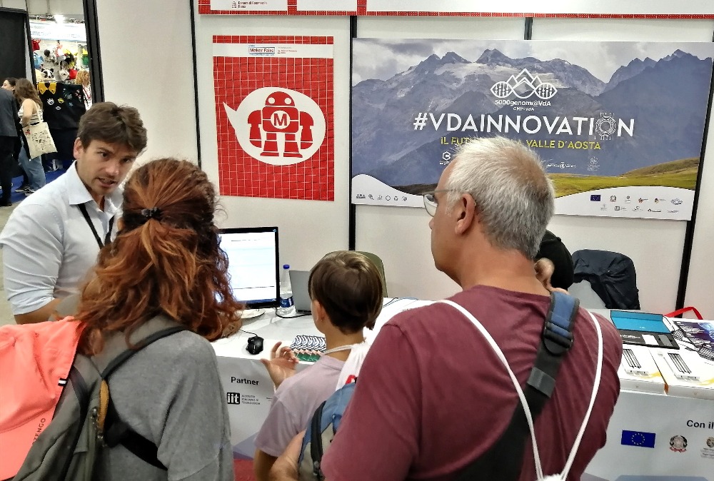 Alla fiera europea sull'innovazione tecnologica, promossa e organizzata dalla Camera di Commercio di Roma, centinaia di persone tra professionisti, maker, ricercatori, famiglie e studenti sono venute a scoprire il progetto 5000genomi@VdA. Durante i tre giorni di manifestazione, il personale del Centro ha raccontato il ruolo essenziale della genomica e della bioinformatica nella ricerca che il progetto conduce sulle patologie del neurosviluppo, neurodegenerative, oncologiche e da insufficienza d'organo e sullo studio del genoma della popolazione valdostana.