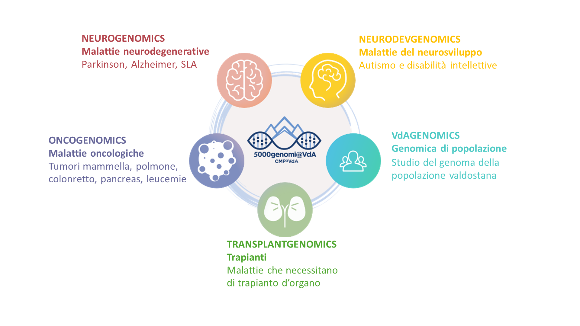 Il progetto mira a studiare il genoma di bambini con disturbi dello spettro autistico e altri disturbi cognitivi, da confrontare con quello dei genitori per indagarne l’origine genetica e migliorare sia i sistemi di diagnosi precoce sia i possibili trattamenti. Verranno anche sequenziati pazienti affetti da Morbo di Alzheimer o Parkinson al fine di identificare varianti genomiche conosciute causative o di suscettibilità per le malattie neurodegenerative. Nel caso degli studi sulle malattie oncologiche, l’obiettivo è sviluppare un nuovo pannello genomico personalizzato per le alterazioni genetiche ad incidenza nella popolazione valdostana. Per quanto concerne i trapianti d'organo, saranno analizzati pazienti che hanno subito, o in procinto di subire, un trapianto al fine di identificare varianti genomiche non ancora riconosciute come causa o fattore di suscettibilità per malattie curabili con la sostituzione d'organo. Il progetto prevede anche la raccolta e l’analisi del genoma completo di 500 persone sane valdostane al fine di costruire un genoma di riferimento per la regione.