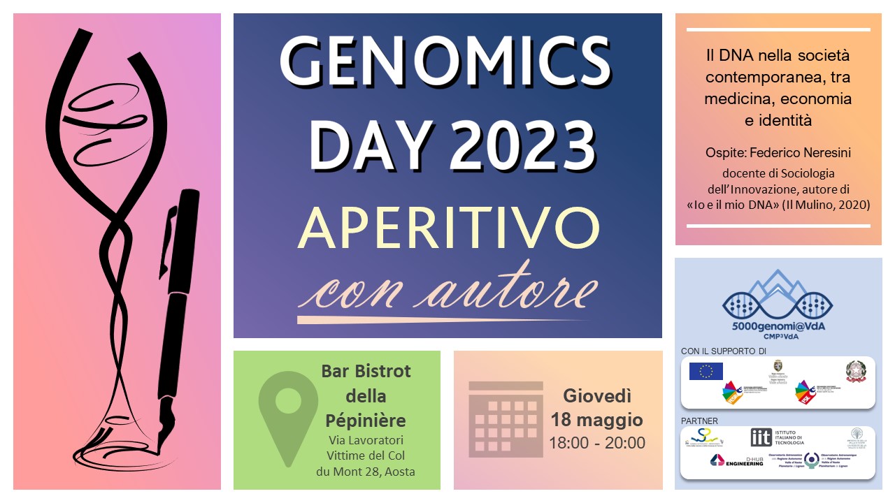 In occasione dei 70 anni dalla scoperta della struttura del DNA e dei 20 anni dalla pubblicazione del genoma umano, il progetto 5000genomi@VdA ha celebrato il Genomics Day di giovedì 18 maggio 2023 con un “Aperitivo con autore” presso il Bar Bistrot della Pépinière, via Lavoratori - Vittime del Col du Mont 28 ad Aosta. All’evento è intervenuto il professor Federico Neresini, docente di Sociologia dell’Innovazione presso l’Università di Padova e autore di “Io e il mio DNA - Abbiamo davvero un destino genetico?” (Il Mulino, 2020).